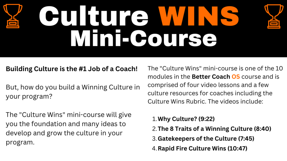 The "Culture Wins" mini-course will give you the foundation and many ideas to develop and grow the culture in your program.