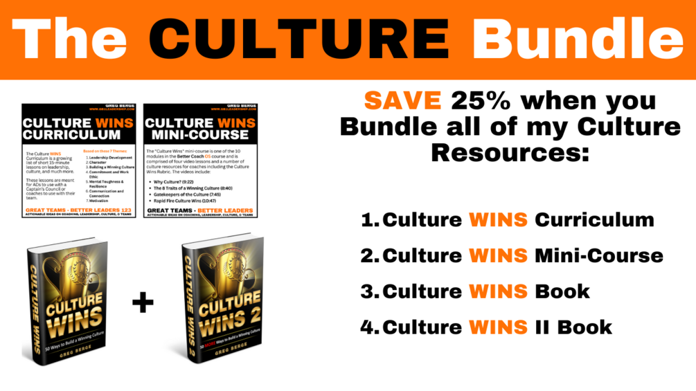 - Culture Wins Curriculum ($49.95 value): The Culture Wins Curriculum is lifetime access to a growing library of leadership and culture videos (3-5 minutes each), along with discussion questions and action steps to use with student-athletes. The library is grouped into seven categories. This curriculum is meant for coaches to use with their team or ADs to use with a "Captain's Council" concept in their school. As this curriculum grows, the cost will increase. Get it now to get lifetime access to ALL the resources added over time.