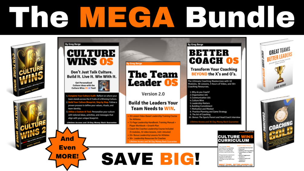 You will get lifetime access to ALL of my paid resources at a huge discount! Includes the Culture Wins OS (NEW), Team Leader OS, and Better Coach OS, my very popular coaching and leadership courses. Build the leaders your teams needs to WIN; Be a better coach and build a better team. You will also get my growing Culture Wins Curriculum, as well as all four of my books. Finally, the pre-season and off-season playbook will help you prepare year-round. Everything you need to be the best coach you can be.